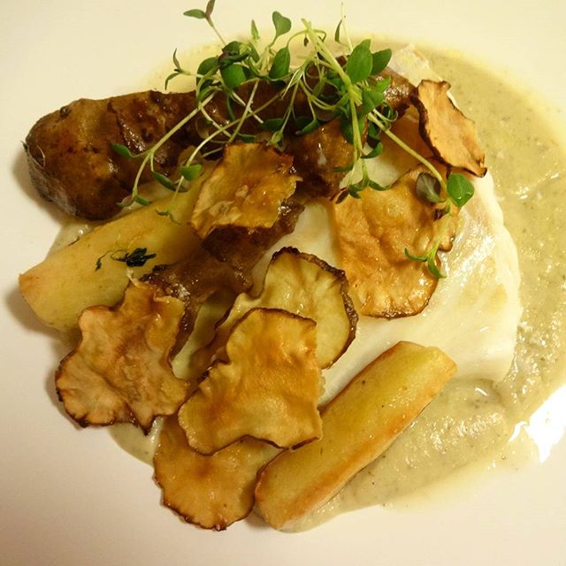 Skrei med jordskokk på 3'måter (chips, puré -og stekt) -epler & timian ✿