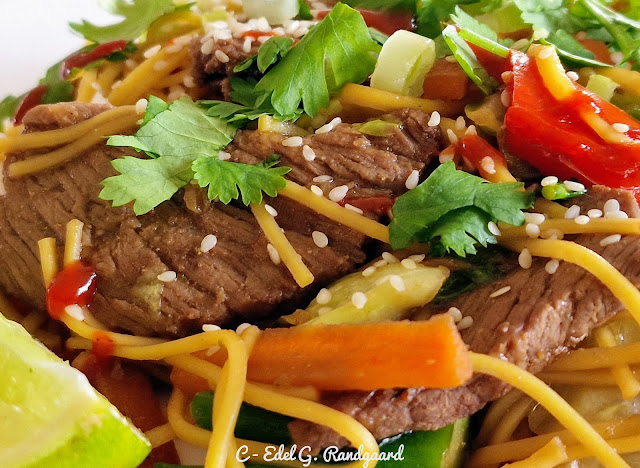 - Stek grønnsakene i samme panne til de er varme, men fremdeles sprø. Bland inn biffkjøttet og nudlene.
